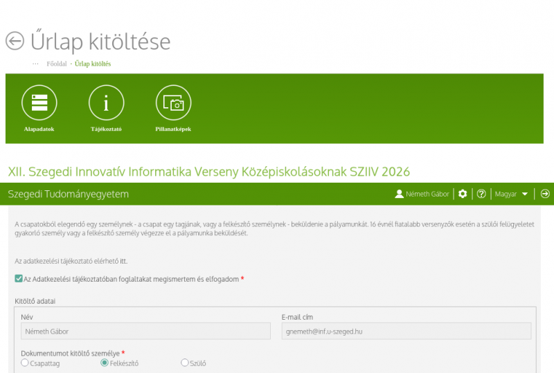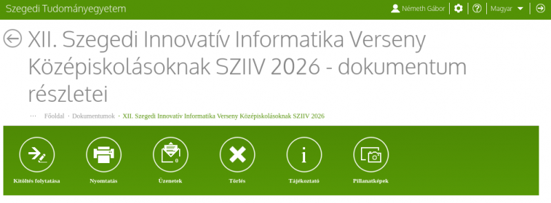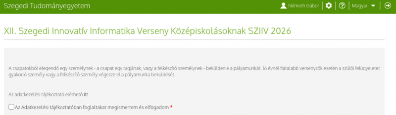 Verseny kiválasztása Nyissa le a Szegedi Innovatív Informatika Verseny Középiskolásoknak (SZIIV) űrlaplistáját! Válassza ki a megjelenő listából a XII. Szegedi Innovatív Informatika Verseny Középiskolásoknak 2026 versenyt! |