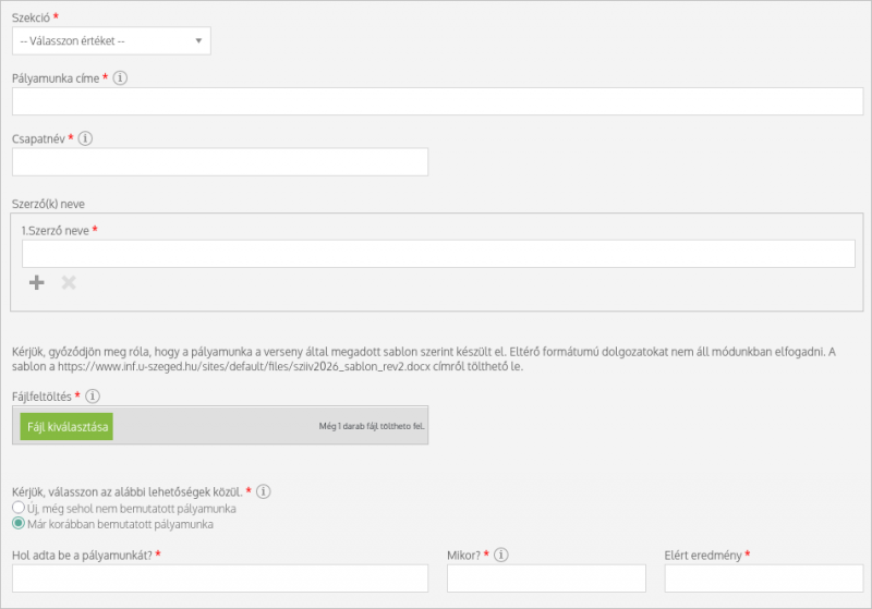 Pályamunka beadása Válassza ki a szekciót! A Szegedi Innovatív Informatika Verseny esetében Informatika és Műszaki informatika szekciók közül választhat. Adja meg a pályamunka címét! Adja meg a csapat nevét! A pályamunkát a csapatnévhez kötjük. Adja meg a szerzőket abban a sorrendben, ahogyan az a pályamunkában szerepel! Egy mezőbe csak egy szerzőt írjon! A plusz jelre kattintva adhat a listához további szerzőket. A pályamunkát a megadott sablon szerint kell megformázni. A fájlt DOC vagy DOCX formátumba töltheti fel. Amennyiben a pályamunka nem új, hanem korábban valamilyen versenyen vagy rendezvényen be lett már mutatva, akkor kérjük, hogy adja meg a rendezvény nevét és időpontját (négy számjegyből álló év és két számjegyből álló hónap kötőjellel elválasztva, ÉÉÉÉ-HH formátumban), valamint az elért eredményt. |