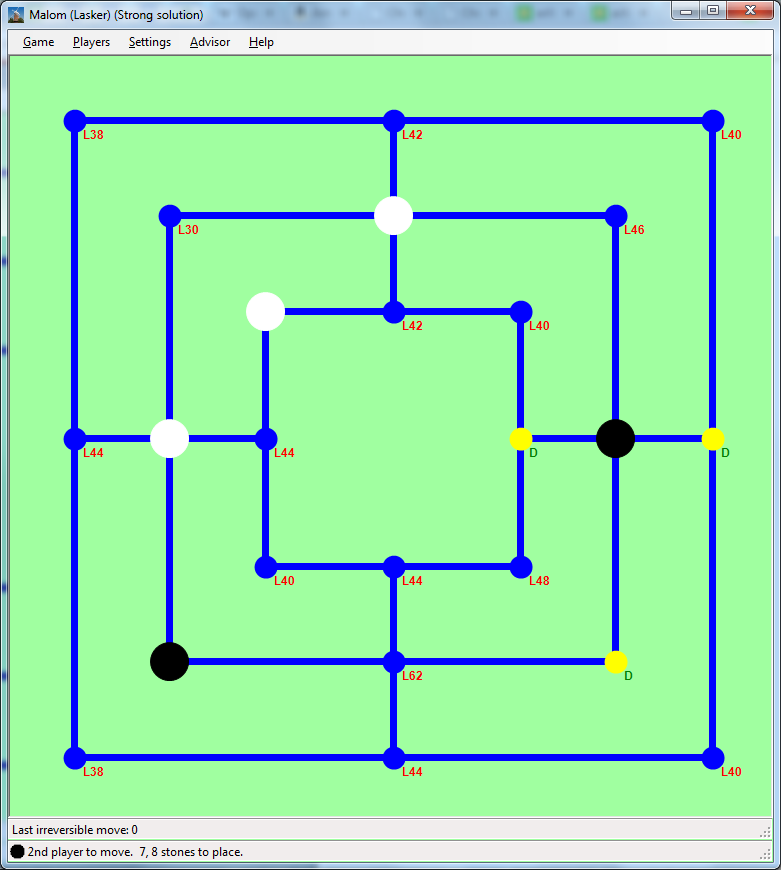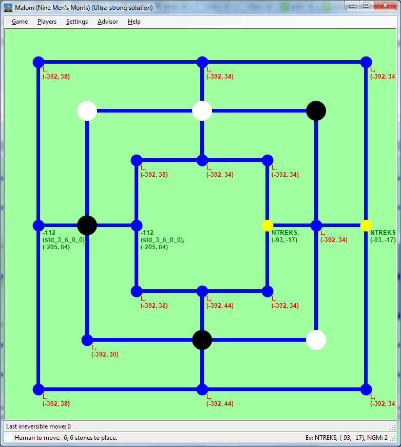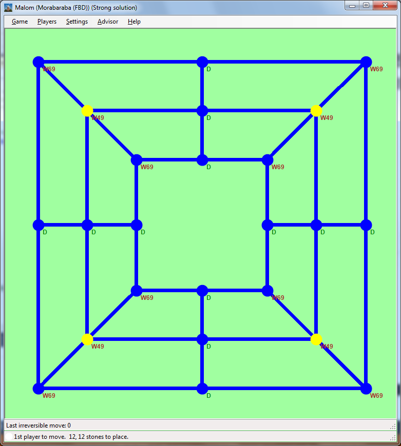 Nine Men’s Morris (Mills, Mühle), and its variants, Morabaraba, and Lasker Morris are popular board games. (You can read the rules here, or in our paper.) Here we provide resources (databases, executables, sources, and theoretic background) about solving these games. You can play with the computed databases, or even recompute them, with our program, Malom. For more details on the algorithm, see our paper, which appeared in IEEE Transactions on Computational Intelligence and AI in Games. (You can cite it like this.)