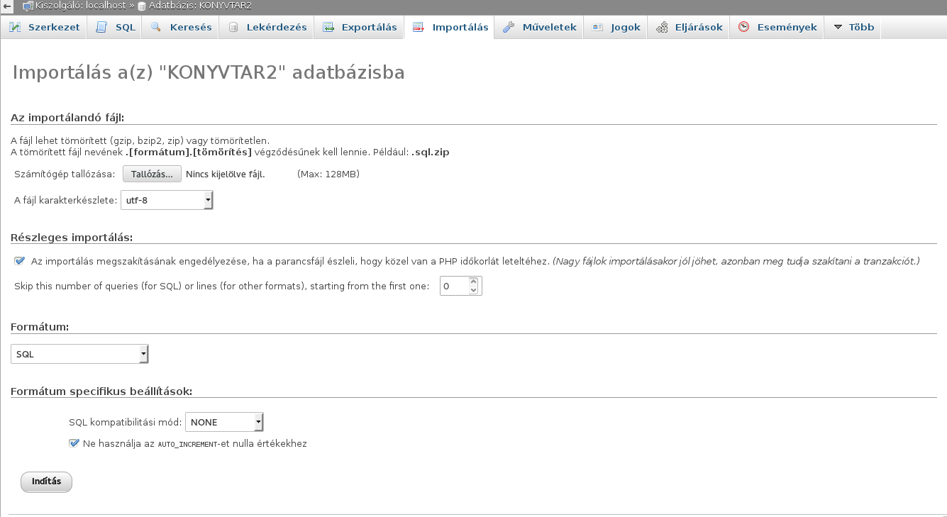 Jelöljük ki ezt az adatbázist (lépjünk is bele) és válasszuk a felső gombsorból az Importálás gombot. Ezt követően a Tallózás... gombra kattintva válasszuk ki a KONYVTAR.sql fájlt.