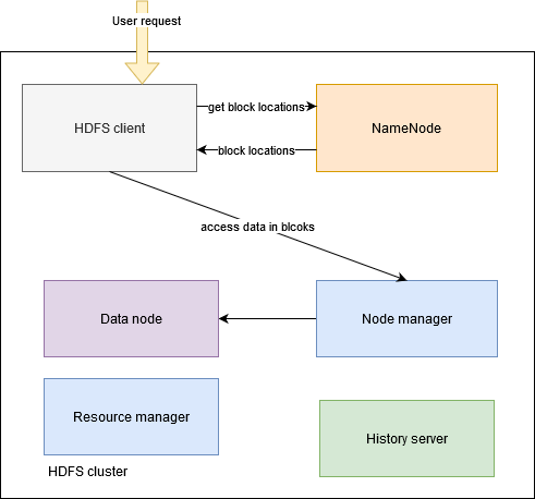 $ docker compose up -dA parancs hatására a megfelelő Docker image-ek letöltődnek a Docker-Hub [4] központi image tárhelyről, lefordulnak és előállnak a szükséges állományok, majd a fenti szolgáltatások elindulnak. A futó szolgáltatásokat és a Hadoop klaszter elemeit az alábbi ábra szemléltet.