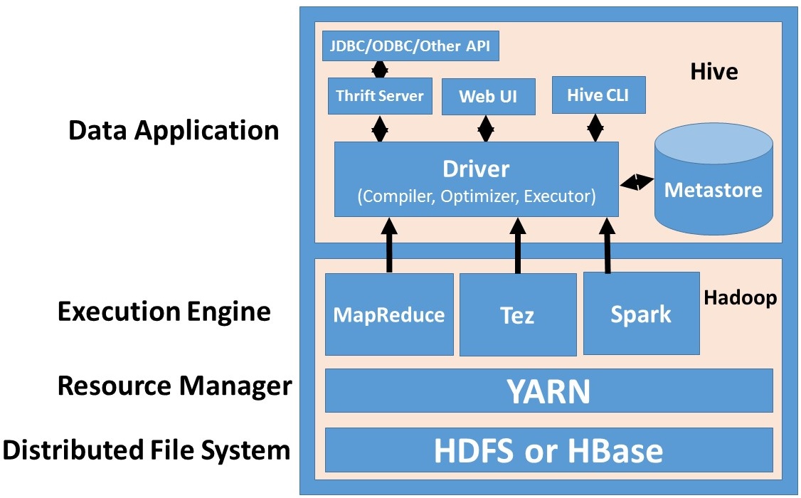A Hive az Apache Hadoop-ra építve (lásd lenti ábra) az alábbiakat nyújtja: