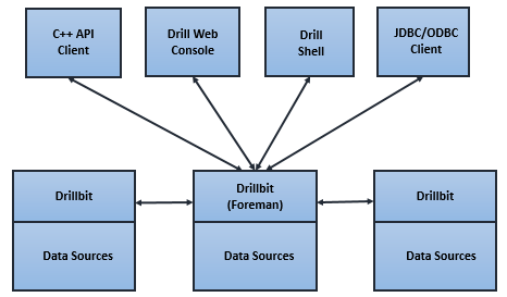 A Drill elosztott végrehajtási környezet (lásd fenti ábra) lelke az ún. "Drillbit" szolgáltatás, amely fogadja a kliensek felől érkező kéréseket, végrehajtja azokat és visszaküldi az eredményt. A Drillbit szolgáltatás telepíthető pl. egy Hadoop klaszter minden egyes csomópontjára. Ebben az esetben a Drill maximálisan kihasználhatja az adat lokalitást, azaz nem kell az adatokat átmozgatnia a hálózaton. A klaszter menedzsmenthez a ZooKeeper-t [18] használja, amely az egyetlen függősége, egyébként tetszőleges klaszteren képes működni, nem csak Hadoop-on, viszont a YARN-nal is integrálható (így nem kell minden csomópontra külön telepítenünk, a YARN elvégzi a deploy-t). Egy-egy Drillbit belső felépítését a lenti ábra mutatja.