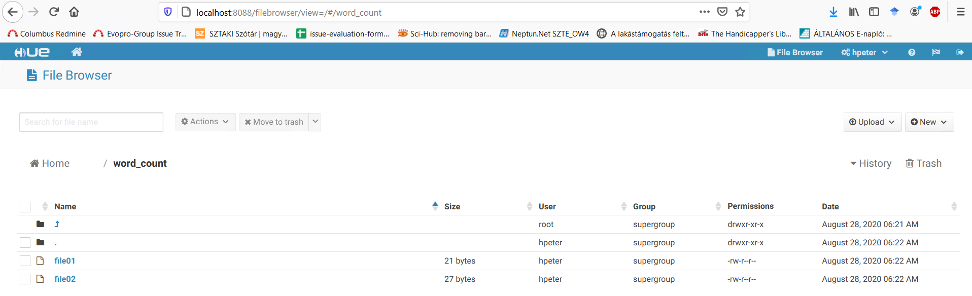 scala> df.flatMap(line => line.split(" ")).map(w => (w, 1)).groupBy("_1").sum().collect()A fenti megoldást alkalmazzuk HDFS-en tárolt szövegállományokra is. Először másoljuk fel HDFS-re a code/5g_BigData-mapred-SPOC/input mappában található file01 és file02 állományokat, majd a fenti word count megoldást hajtsuk végre azokat használva bemenetként. Átmásolhatjuk a fájlokat először a namenode container-be, majd onnan a hadoop klienssel feltölthetjük a HDFS-re, ám a Hue használatával egyszerűbben is felmásolhatjuk a fájlokat. Nyissuk meg a böngészőben a http://localhost:8088/filebrowser/#/ címet, és hozzunk létre egy új könyvtárat a New gomb segítségével ("word_count"), majd az Upload-ot használva tallózzuk ki a két fájlt és töltsük fel őket HDFS-re közvetlenül a lokális gépünkről (lásd ábra).