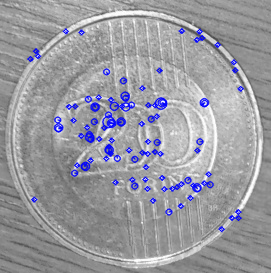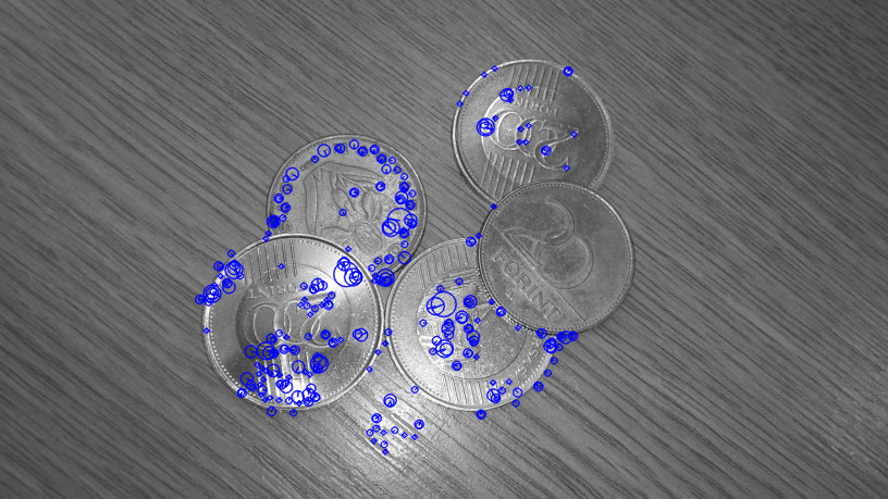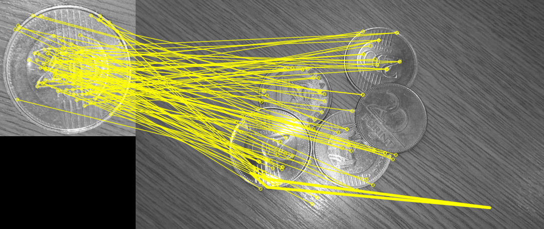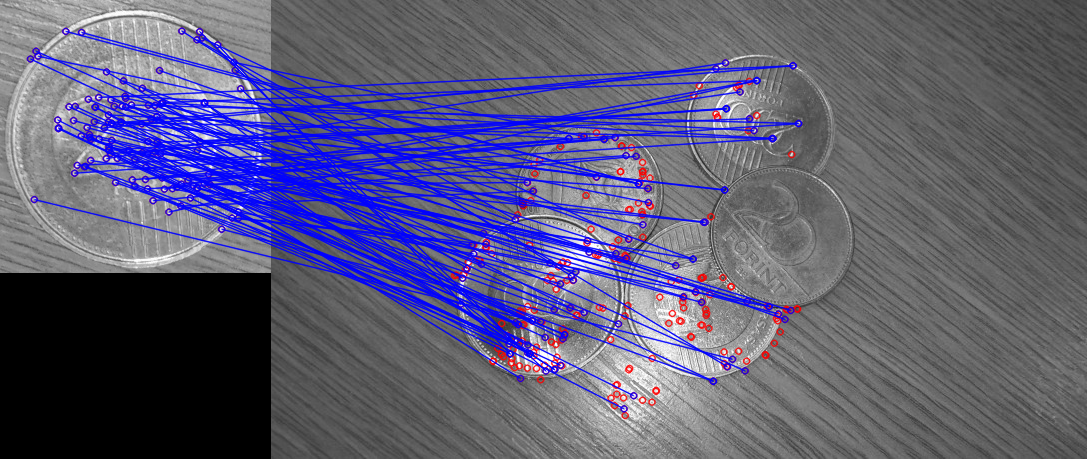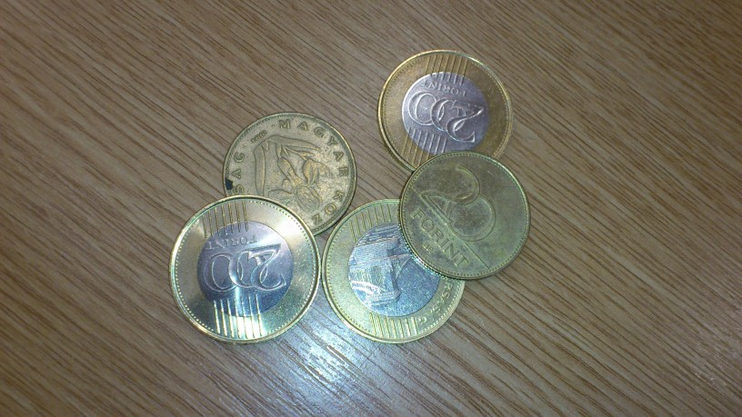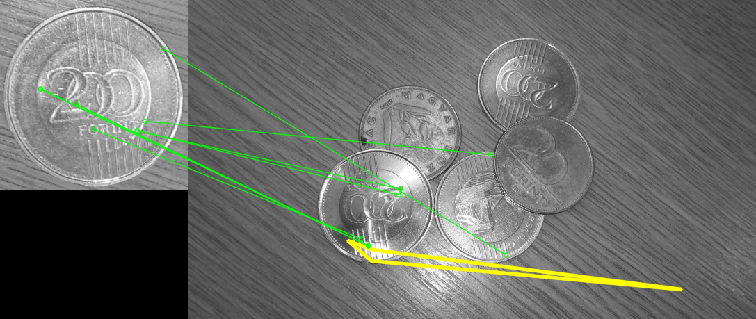 A példatár Mintakereses_penzermek mappájában 6 fotót találunk egy asztallapról, amelyen többféle pénzérme található, némelyik egymással átfedve. Szeretnénk megkeresni a 200 forintos érmék előlapjait. Ehhez az egyik képből kivágott erme_minta_200_elolap.jpg mintát használjuk.