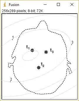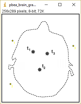 • Jelöljünk ki rajta egy ponthalmazt. A példánkban 3 pontot jelölünk ki a koponyacsonton kívül (sárga pontok), ezzel szimulálva a sztereotaktikus keretet, illetve a nem szimmetrikus elrendezést, ami a gyakorlatban nem szerencsés. Erről szeretnénk meggyőződni.