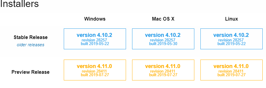 A letöltési résznél elérhetjük a Windows, Linux és MacOS-re előre lefordított változatokat. Stabil kiadásból évente kettő jelenik meg. Célszerű ezzel kezdeni az ismerkedést. A "Nightly build"-ek naponta készülnek az éppen aktuális kódbázis alapján. Ez erősen kísérleti jellegű, akár nem megfelelően működő részeket is tartalmazhat! Természetesen a forráskódhoz is hozzáférhetünk verziókövető rendszer segítségével.