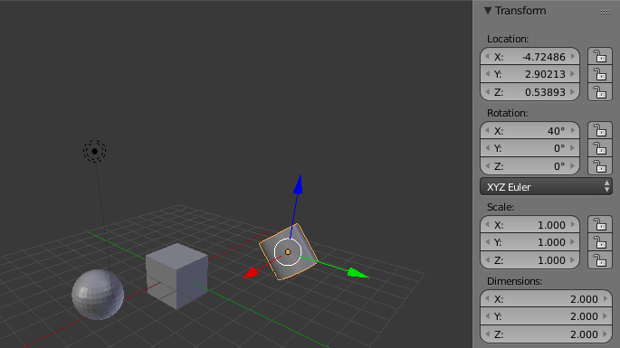 A paraméterek beállításához célszerű a jobb oldali Tulajdonság panelt bekapcsolni az N billentyűvel. A panel felső részén jelennek meg a transzformációs paraméterek.