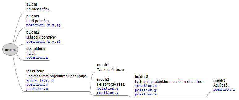 Megjegyezzük, hogy a mesh2 objektumot a mesh1-hez is hozzáadhatjuk, ebben az esetben nincs szükség a tankGroup objektumra sem.