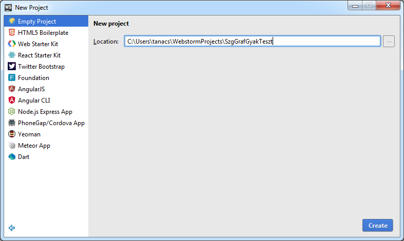 A Create New Project gombra kattintva új projektet indíthatunk. A megjelenő dialógusablakban kiválaszthatjuk a projekt típusát (számos keretrendszert ismer és támogat a WebStorm), valamint meg kell adnunk a projekt elérési útvonalát.